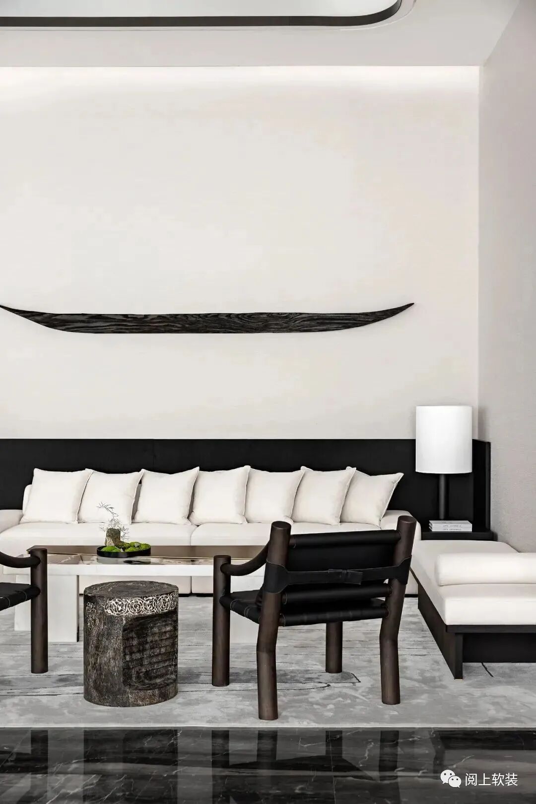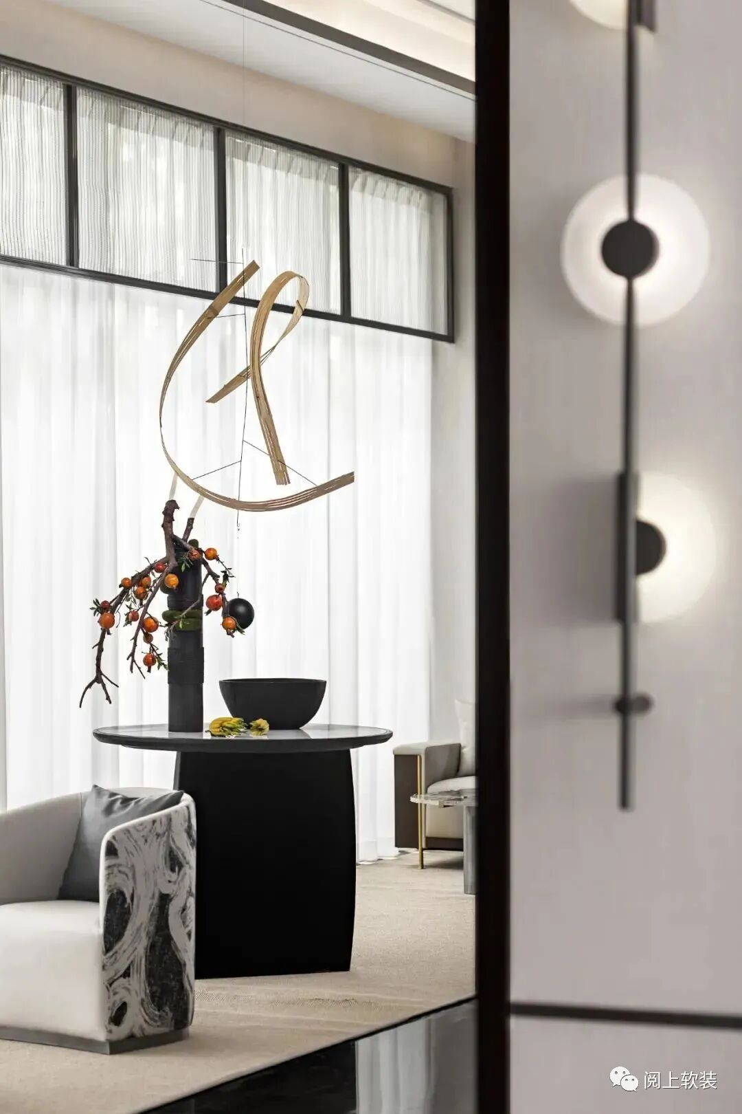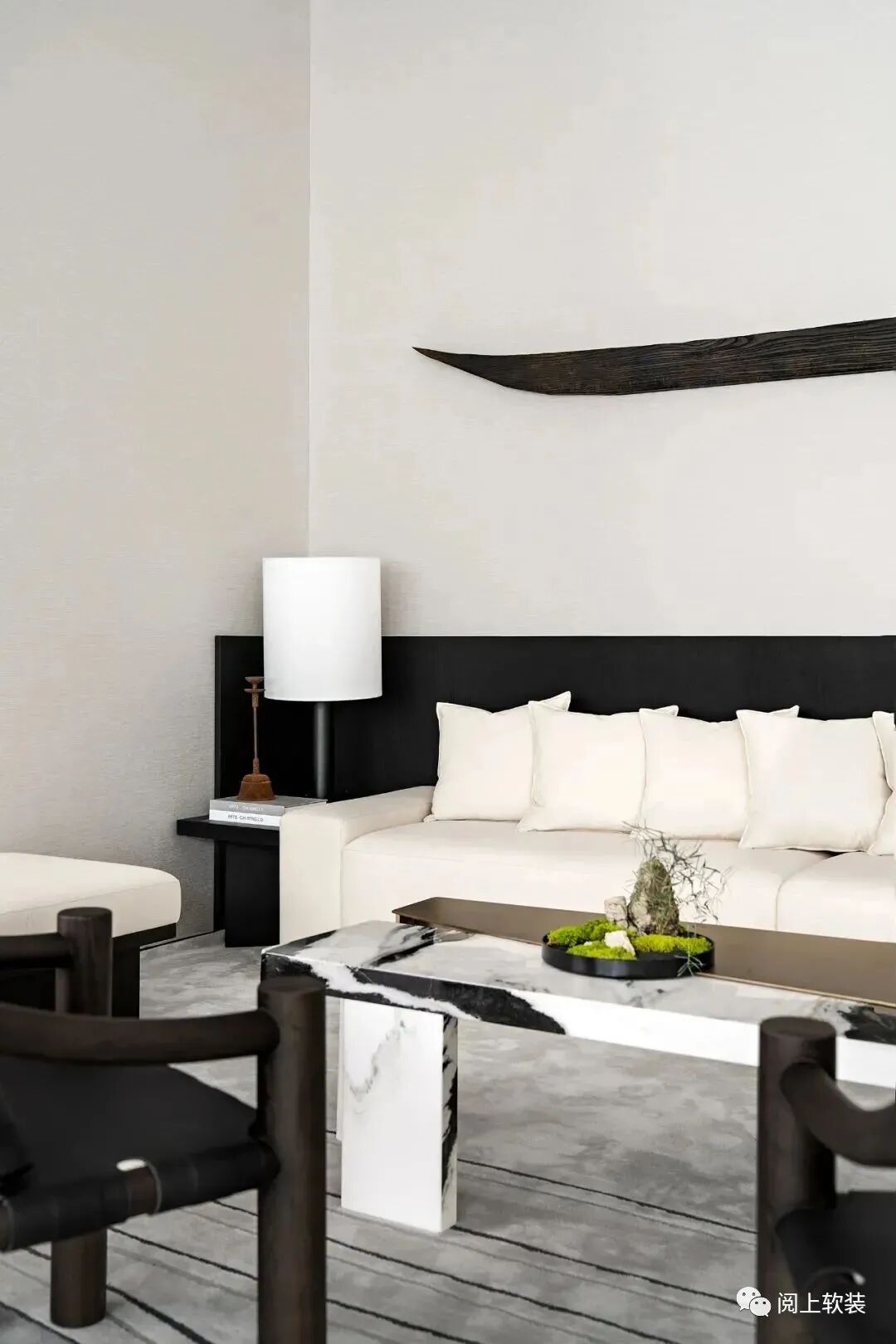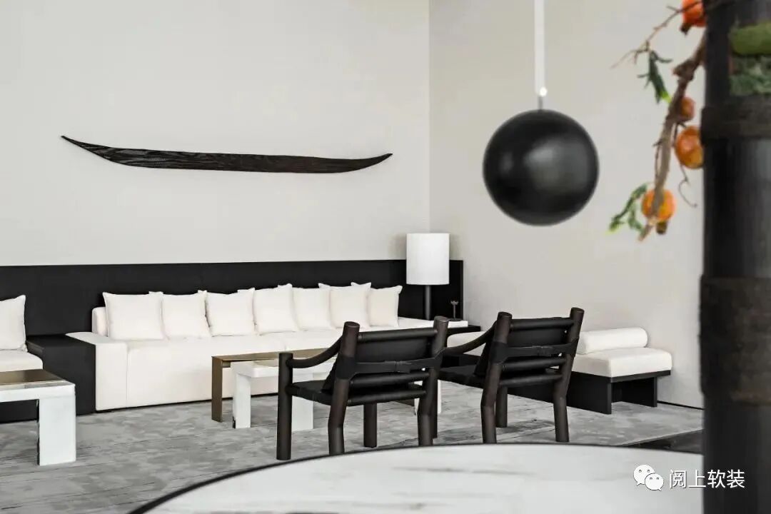 在洽談區的一側是設計的點睛之筆,窗外是開闊的山水意趣,窗內是細節的二分,吉米·諾斯的雕塑中有趣地融合了二分法,形似枯山水的室內裝置藝術蘊含著當代理念,隨著時間的流逝,選定的植物與無機混凝土糾纏在一起,形成了一個不斷發展和生動的雕塑形式,工業材料的使用進一步模糊了自然發生與人為之間的區別。