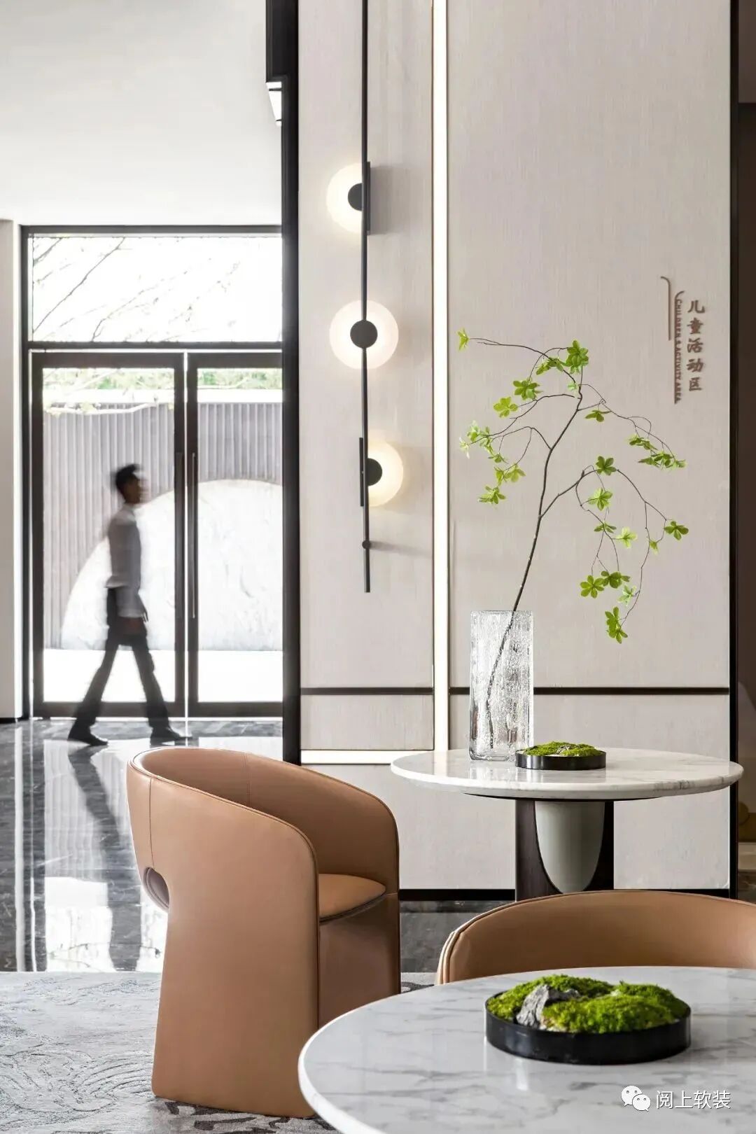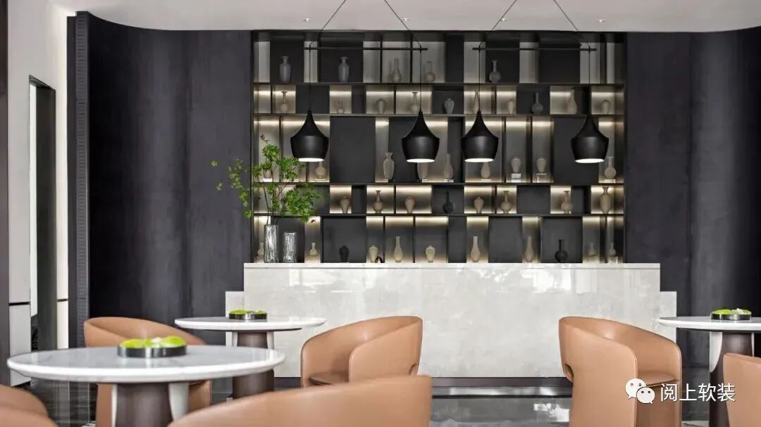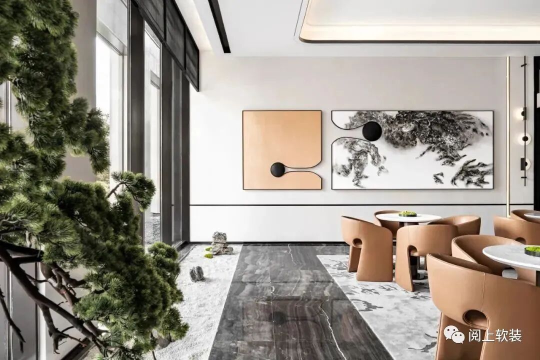 開放的洽談區大面積的落地窗,引光而入,氣韻悠長,成片的黑灰大理石本就如同深遠的水墨,搭配暖杏色的皮革沙發,幾何形狀的桌椅和燈具,用不同材質的割裂與融合勾勒出層次巍峨的云水剪影。