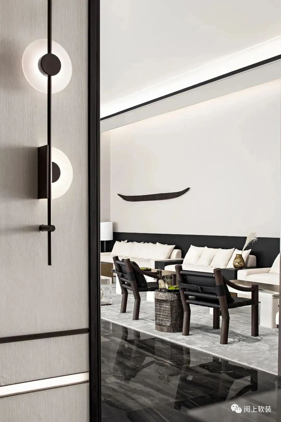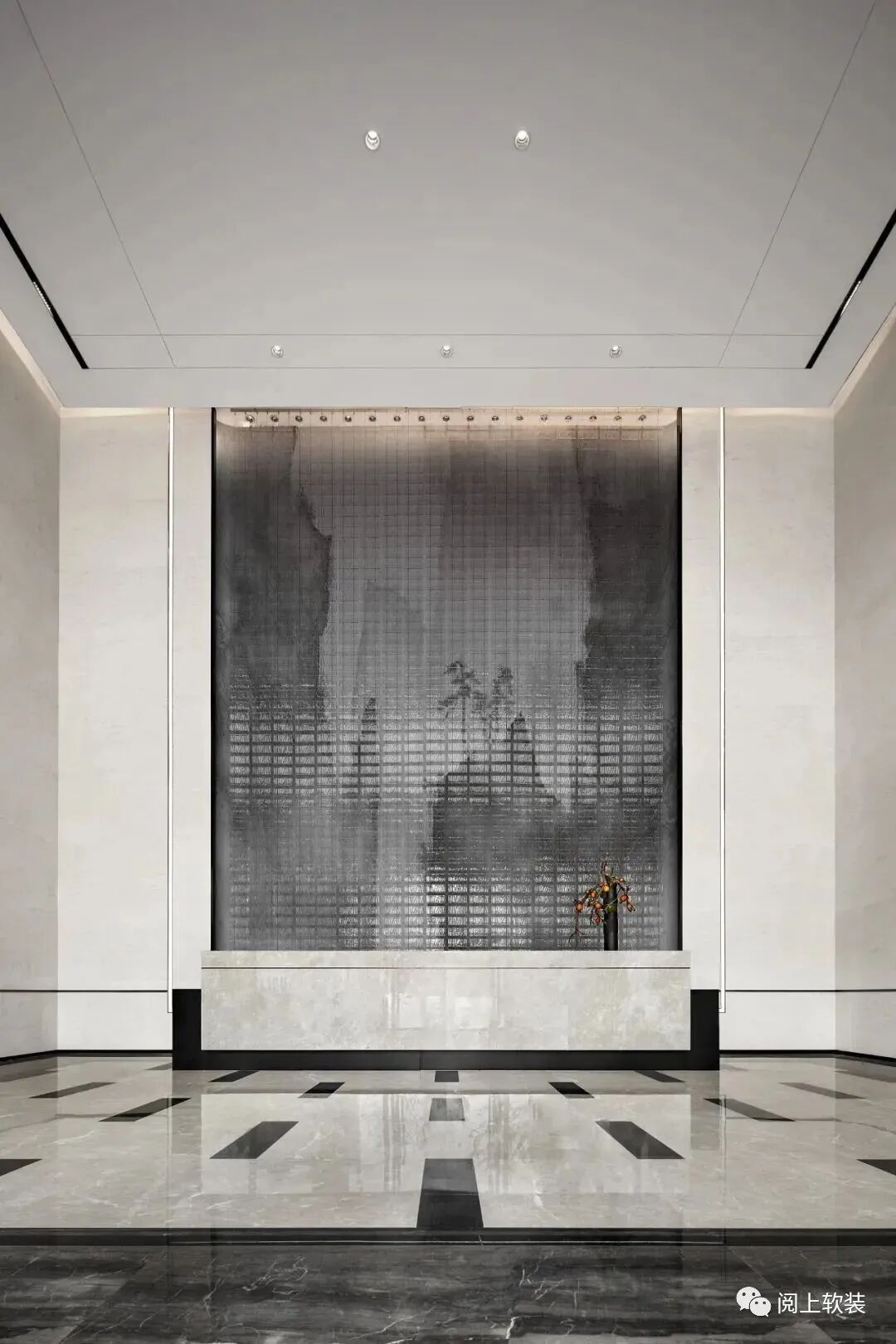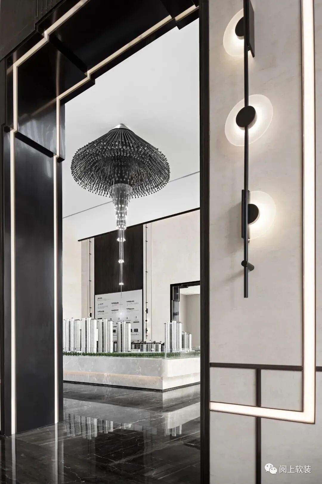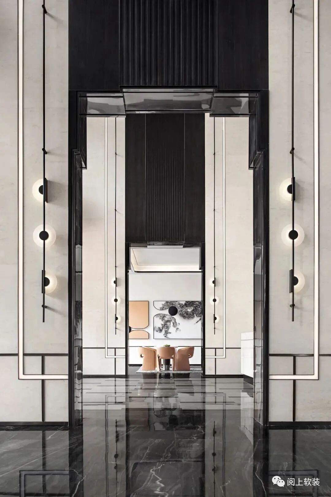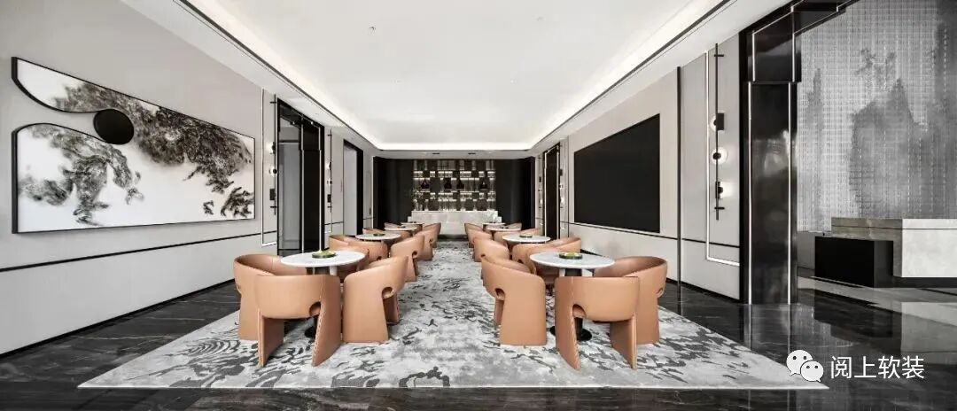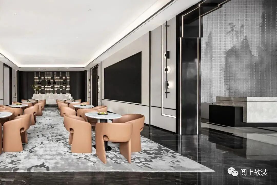 接待前廳作為連接眾多場域的中心,延續入口橋廊磅礴中帶有氣質感的設計情景,以黑色胡桃木及灰玉大理石、山水圖樣隔斷,藉由豐富多元的材質搭配,在接待前廳營造充滿文化風韻的迎賓場所,進門處的“山水海云”為主題的景墻對應著哲學的空靜之境,看似虛無的潑墨卻也存在實在的價值構建,傳達設計之初的可觸摸、可諦聽、可演繹的現代東方。