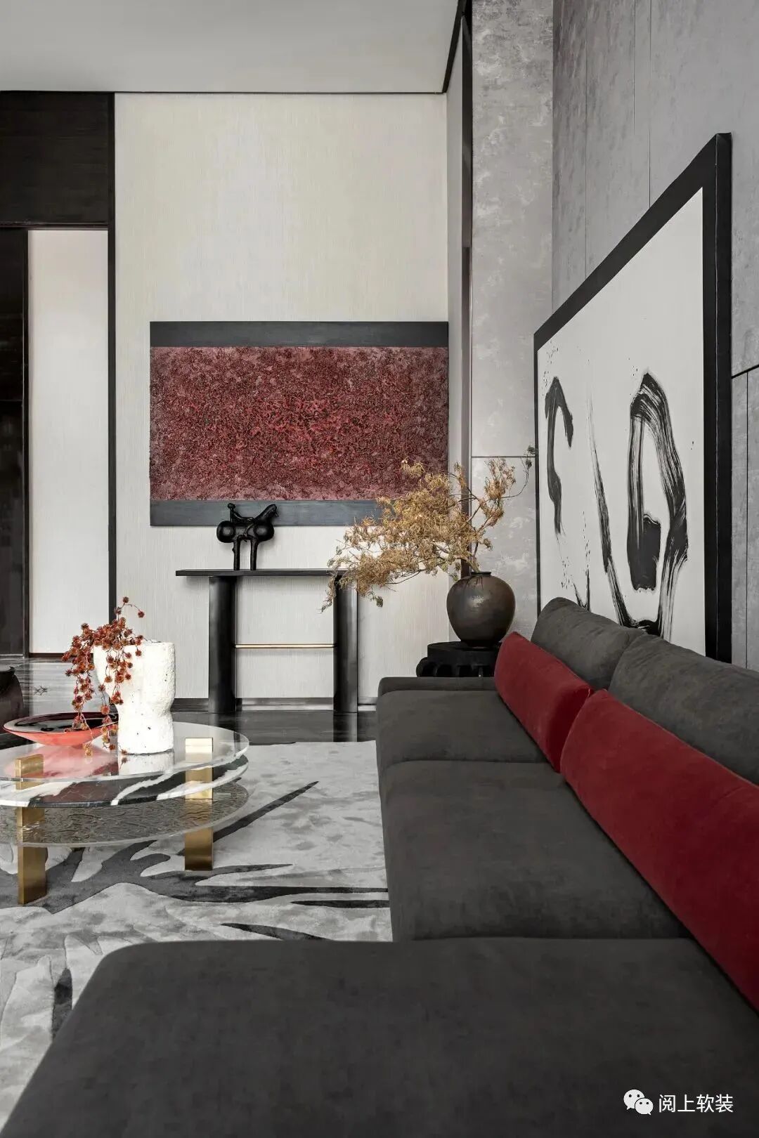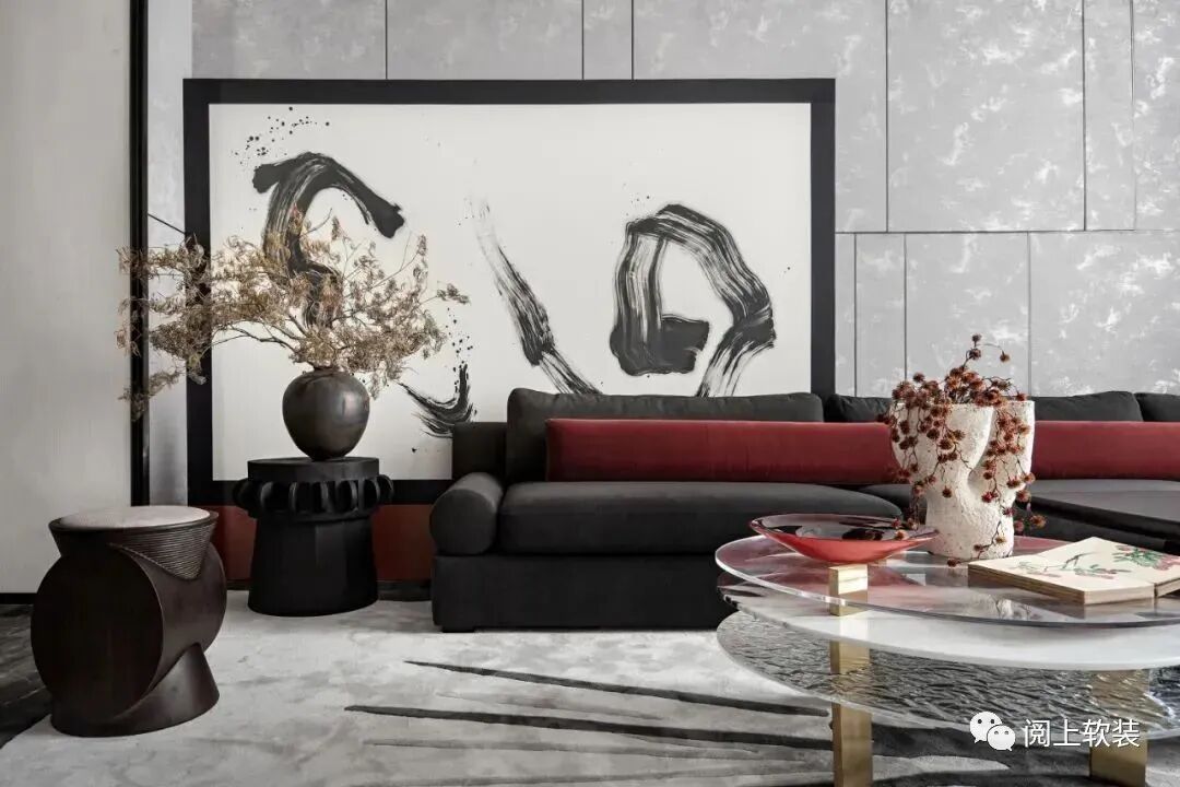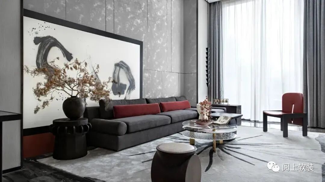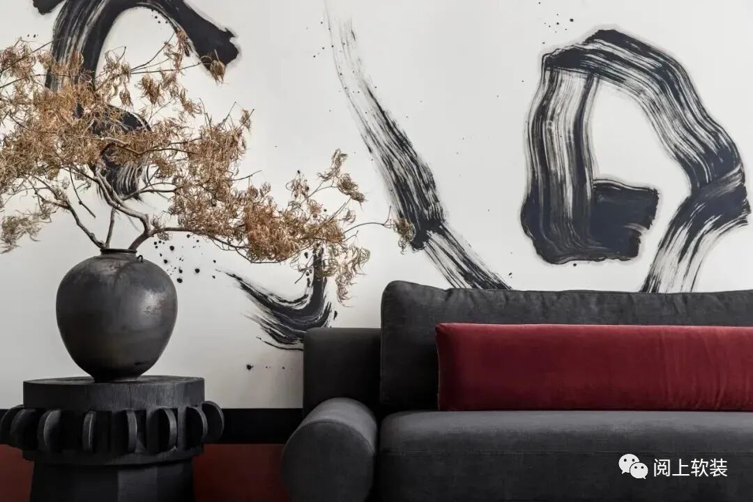 VIP洽談室則遵循著傳統十二繪色譜,從中嘗試創新現代墨黑套色組合,明暗對比,色系相近,以此勾勒空間的設計感,摒棄過多的色彩堆砌,取自然的灰感與實木,少許點綴朱紅、胭脂紅和玻璃的通透頗有氣勢,這使得傳統繪畫中經典的配色方式巧妙鋪設到界面,背景墻的裝飾畫通過肌理處理,呈現出麻刀灰似宣紙版的視覺效果,加強室內空間卓爾不凡的高級感。