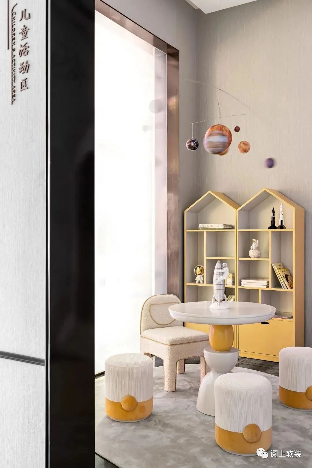 水吧區與兒童娛樂區串聯起四方空間,水吧高級灰的沉靜的氣質與相鄰的兒童區域形成了生動的對比,立面書架、童趣的世界與柔軟的顏色搭配很好得演繹了現代“去銷售化”的理念,一本書,一杯咖啡,雅致的物理空間承載無限遐想的精神世界,看著自由的孩童,時光在此靜靜雕刻。