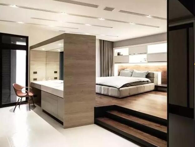 寬敞的臥室,性格的設計,出色的實際效果都讓這一空間表明出非凡的品位。一個寬敞的化妝臺可以做為臥室的半裝修隔斷,讓臥室空間不僅有私密又有自覺性。