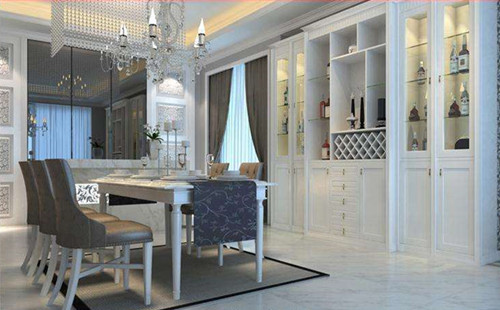 我們可以把酒柜設計方案成一體式的實際效果,可以把整塊墻體設計成酒柜,也就是酒柜不僅會安裝滿全部墻壁。還能夠拓寬到門套的上邊,可以利用上方的室內空間,那樣的貯藏室內空間更高。把酒柜的上邊制成大木柜,隨后在里面放置一些重件的裝飾物來做為裝點,那樣的歐式古典訂制酒柜十分的好用,既美觀又空氣。